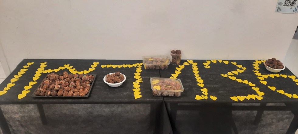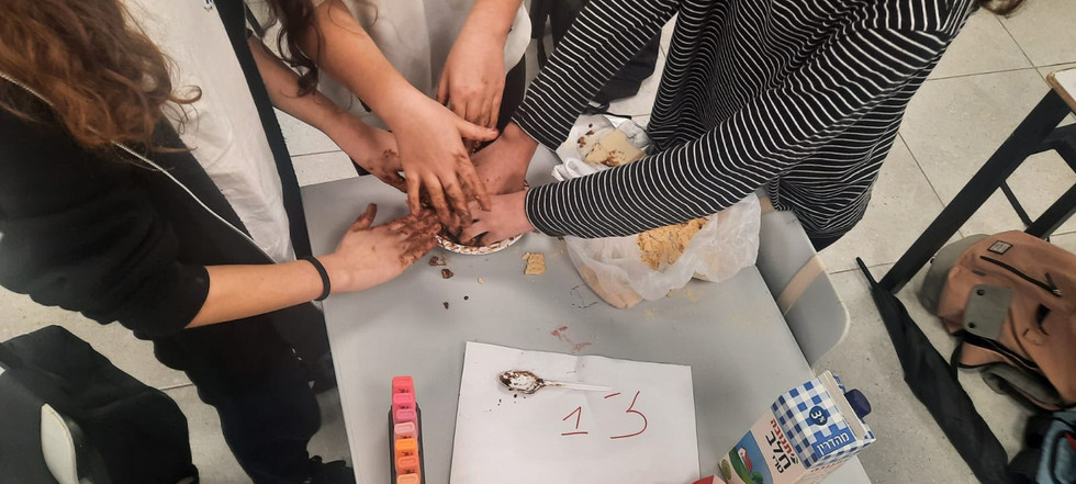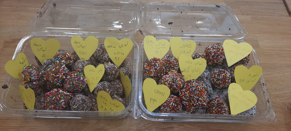 תלמידי ז1 ז4 וט6 הכינו עם המורה דבס זהבית כדורי שוקולד מתוך מתכון בערבית וסידרו בספרה 136 בערבית ובלועזית .תלמידי ט5 ט6 הכינו עם המורות זהבית דבס ונוי דקל 136 לבבות עם שמות החטופים בערבית ועם הכיתוב تملي معك - תמיד איתך.